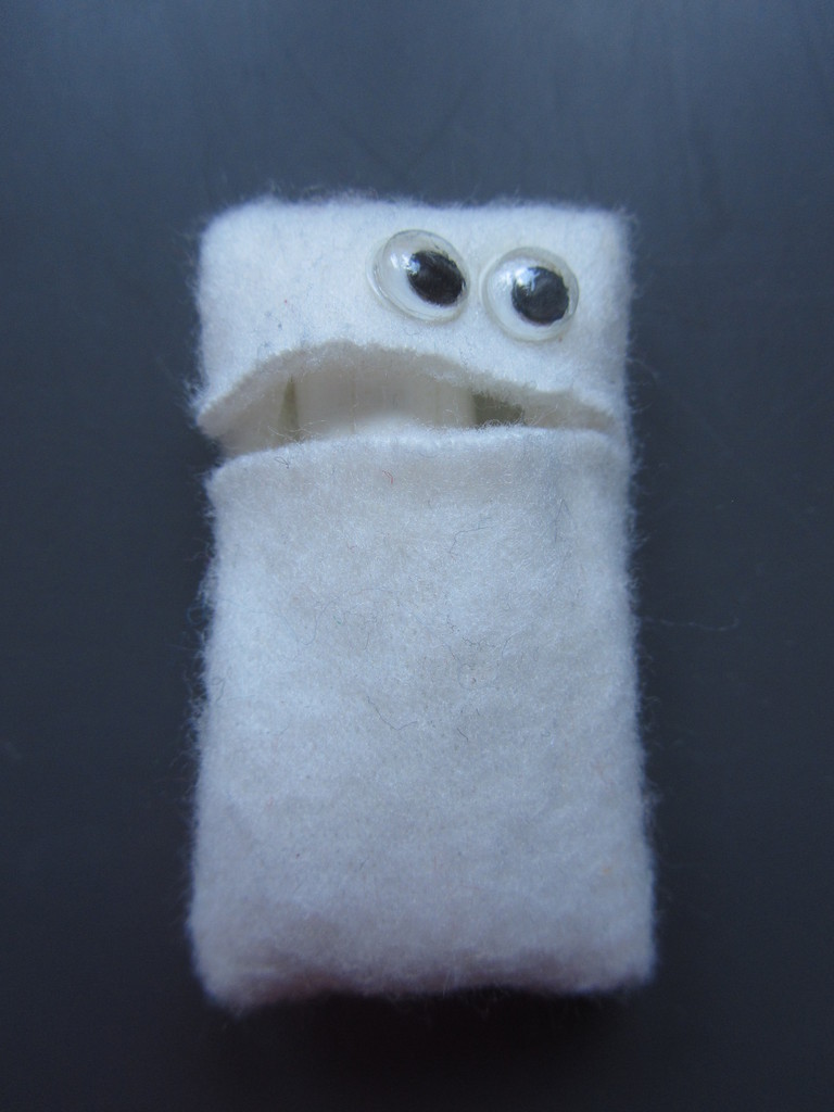 die diskrete Verpackung aus Fleecestoff und Wackelaugen bietet Platz für einen o.b normal oder mini, 5.5 x3cm